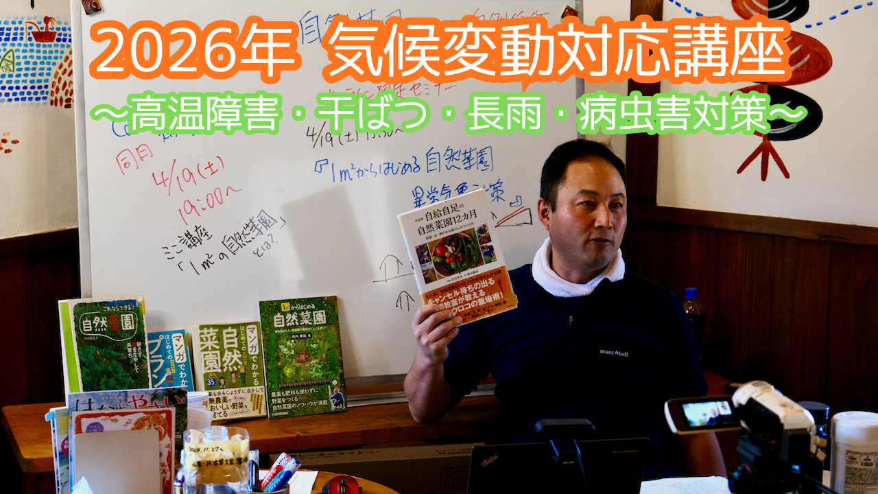 気象庁の2026年の長期天気予報は、「夏の到来は早く 猛暑で多雨の年に」となっており、2026年の菜園では、高温対策とともに長雨、大雨対策も必要になります。長雨の場合、病虫害も増える傾向があります。そこで、今回の2026年気候変動対応講座では、高温障害、干ばつだけでなく、長雨、ゲリラ豪雨などに対応できるように、より菜園のレジリエンス(適応力)を高める講座を行います。